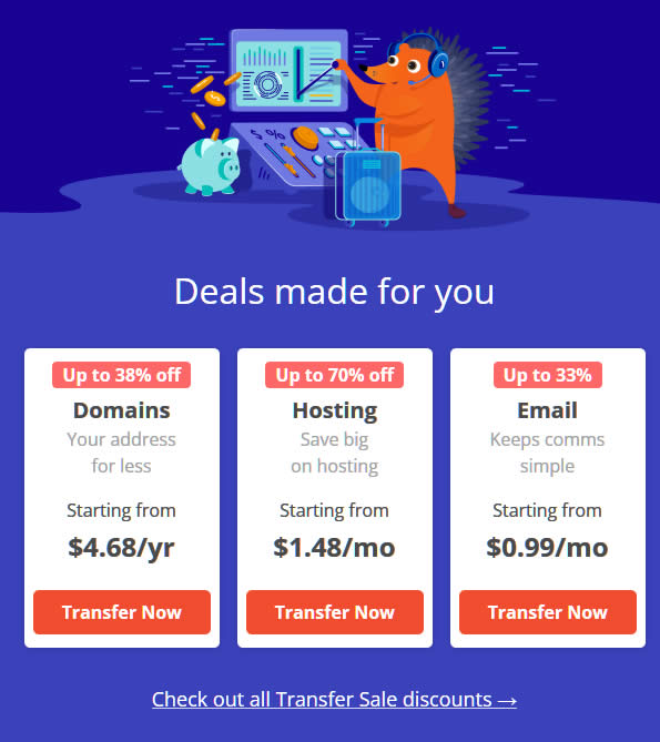 • Up to 38% off domain transfers – Transfer your web address from just US$4.68/year.