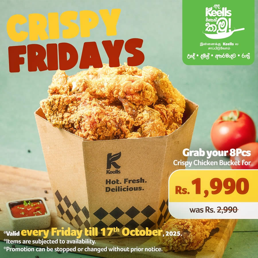 Keells has turned Fridays into the ultimate crispy treat day. With this 8-piece chicken bucket deal running only until 17th October 2025, customers should mark their calendars and head over to the nearest participating outlet to grab this delicious offer before it’s gone. 🛒🍴