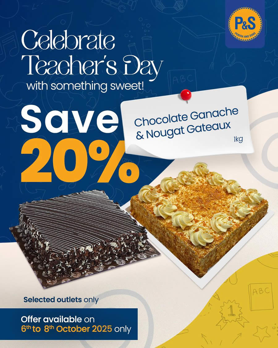 Teachers play an invaluable role in shaping lives, and what better way to express your gratitude than with a delightful cake? This Teacher’s Day, Perera & Sons invites everyone to celebrate the occasion with a delicious offer – enjoy 20% off on their Chocolate Ganache (1kg) and Nougat Gateaux (1kg) cakes!