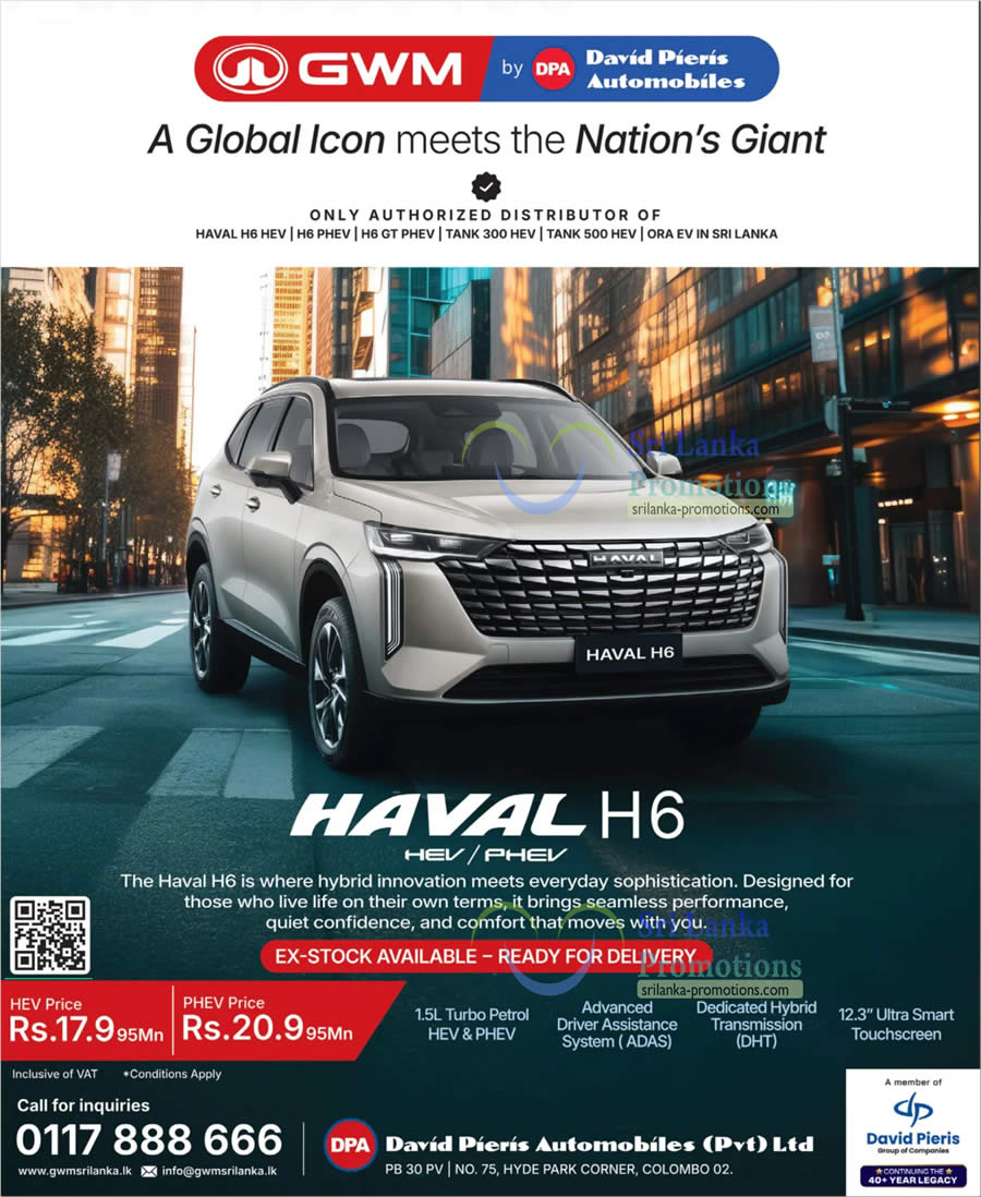 Under the theme “A Global Icon meets the Nation’s Giant”, David Pieris Automobiles (Pvt) Ltd presents itself as the only authorised distributor in Sri Lanka for HAVAL H6 HEV, H6 PHEV, H6 GT PHEV, TANK 300 HEV, TANK 500 HEV and ORA EV.