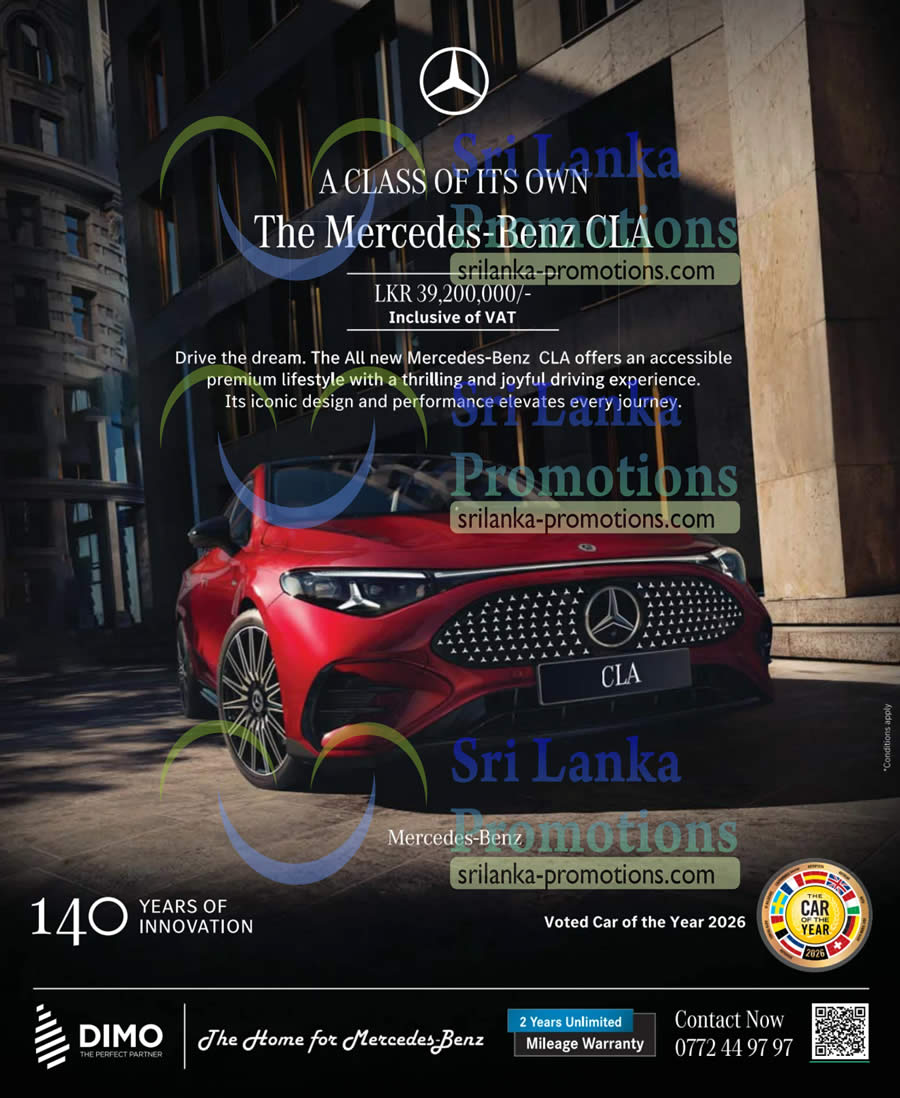The all-new Mercedes-Benz CLA is being promoted in Sri Lanka through DIMO – The Home for Mercedes-Benz. Positioned as a design-led premium offering, the CLA combines striking looks, modern technology and strong brand appeal, while the exact Sri Lanka-market variant and powertrain linked to the quoted price should be confirmed directly with DIMO.