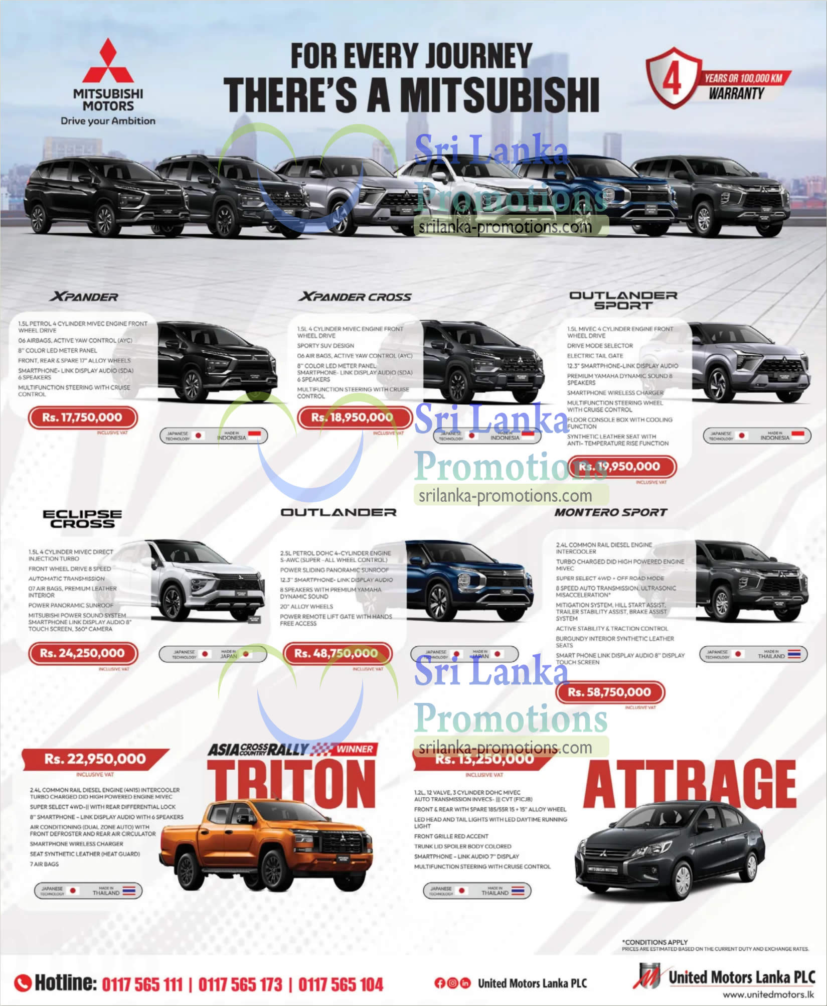 United Motors Lanka PLC has unveiled a full range of Mitsubishi passenger vehicles and pickups with Sri Lankan rupee pricing inclusive of VAT and a manufacturer warranty of 4 years or 100,000 km (whichever comes first). The line-up spans compact family movers to serious 4×4 workhorses, each carrying the “Japanese Technology” badge with country of manufacture noted per model.