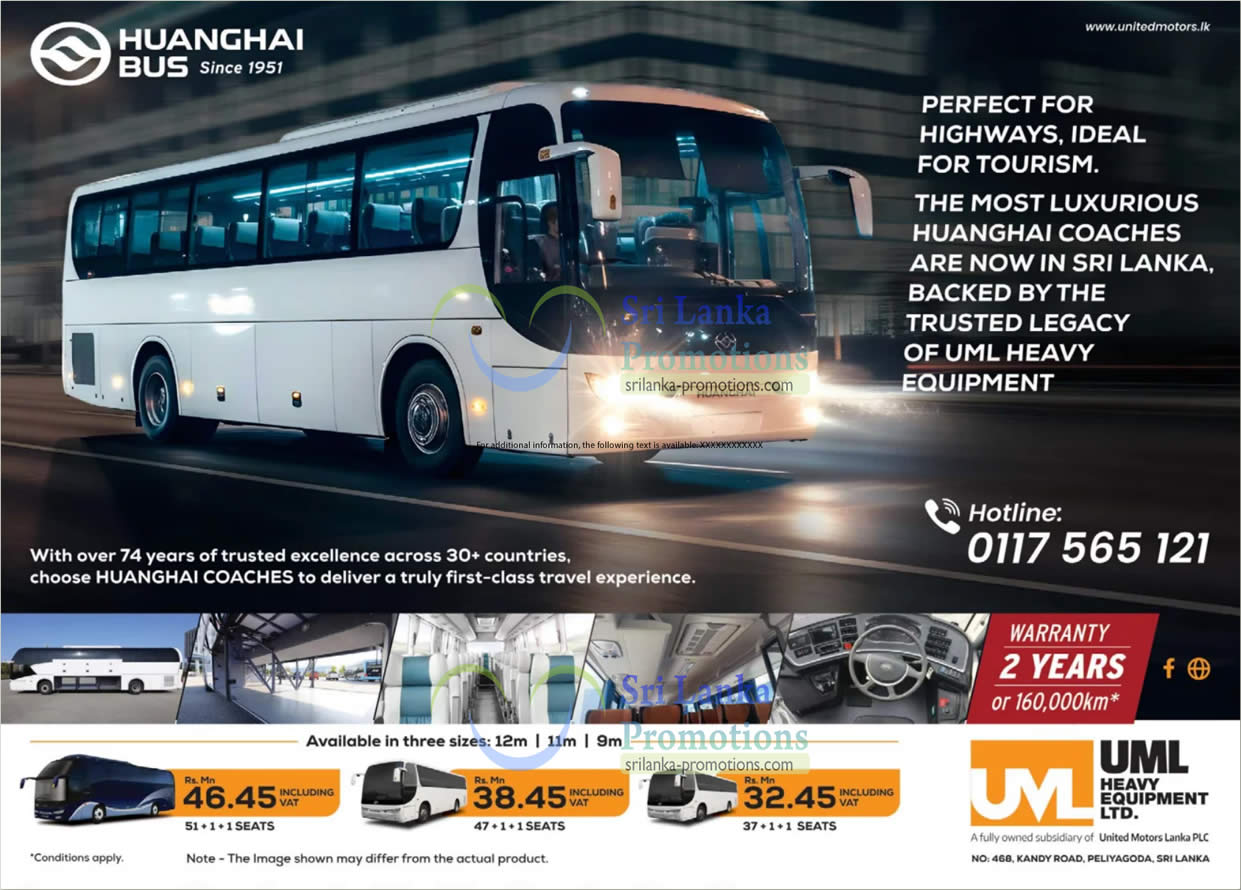 Brought to market by UML Heavy Equipment Ltd.—a fully owned subsidiary of United Motors Lanka PLC—the range of Huanghai Bus coaches (est. 1951) has the brand’s reputation for comfort and durability across 30+ countries and 74+ years of manufacturing heritage.